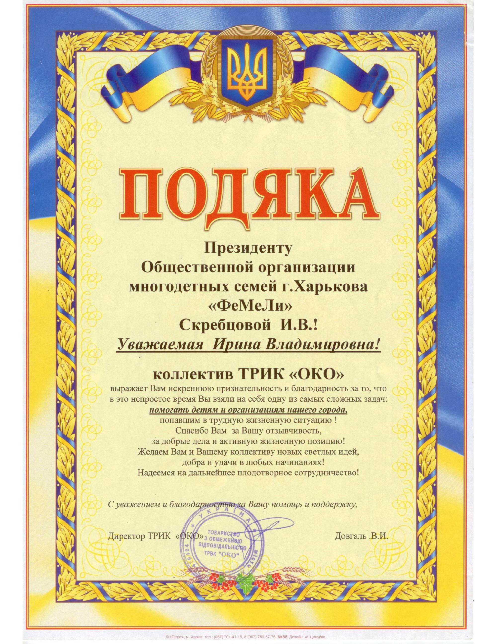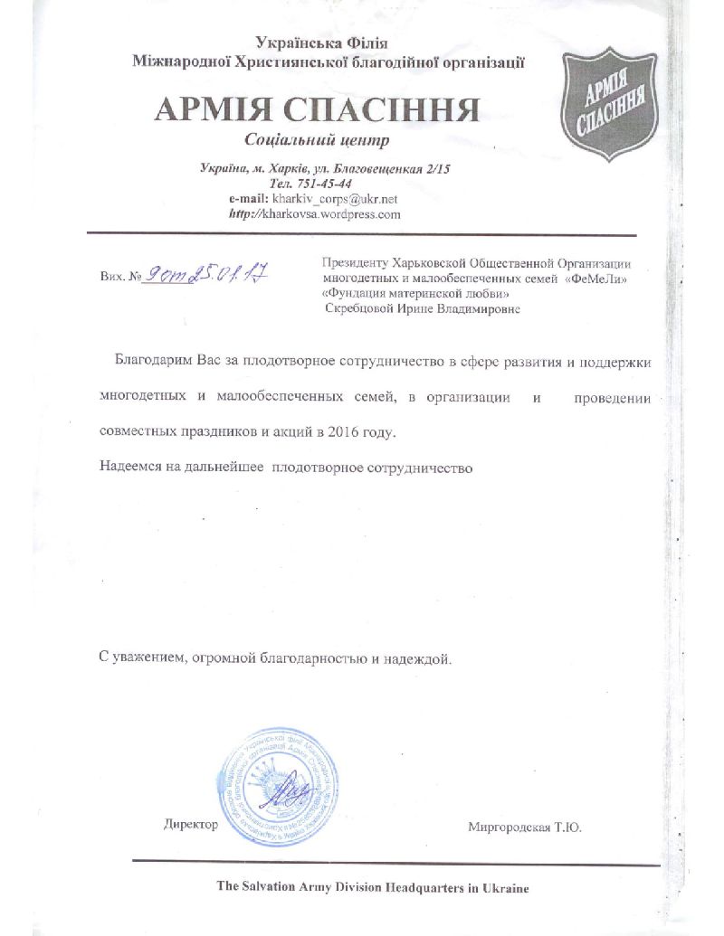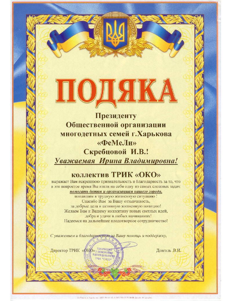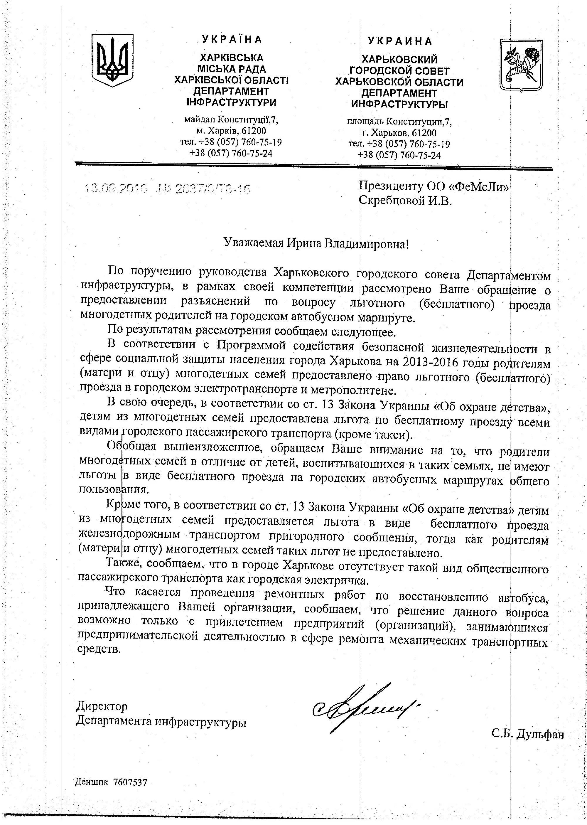 Наша организация обратилась в департамент инфраструктуры Харьковского городского совета за разъяснением вопроса о предоставлении льготного (бесплатного) проезда многодетным родителям на городском автобусном маршруте. 13 сентября 2016 года на имя Президента нашей организации пришел ответ, в котором указывается об отсутствии у многодетных родителей льготы на проезд в маршрутных автобусах г. Харькова.
